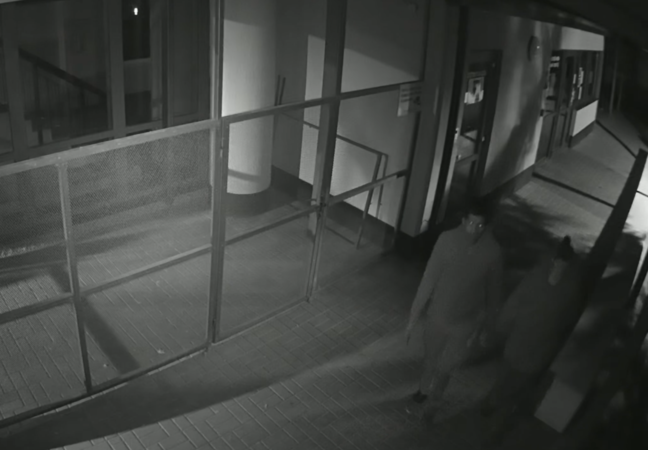 Kamery v blízkosti budovy zachytily dvě osoby, muže a ženu, které místem procházely. Právě tito dva lidé by mohli být pro policisty důležitými svědky, protože právě oni si mohli všimnout pohybu neznámého pachatele uvnitř nebo před budovou a mohli by nám poskytnout důležité svědectví.